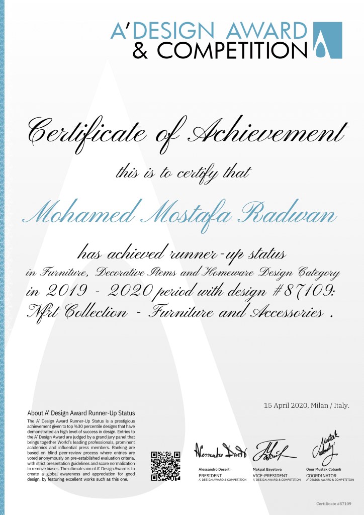 Certificate of Achievement, A’Design Award, Runner up, Furniture Design Category, Italy, April 2019.