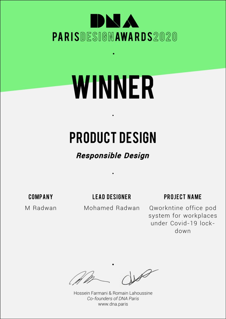 Certificate of Award, DNA Paris Design Awards 2020, in the Responsible Design Category, France, May 2020.