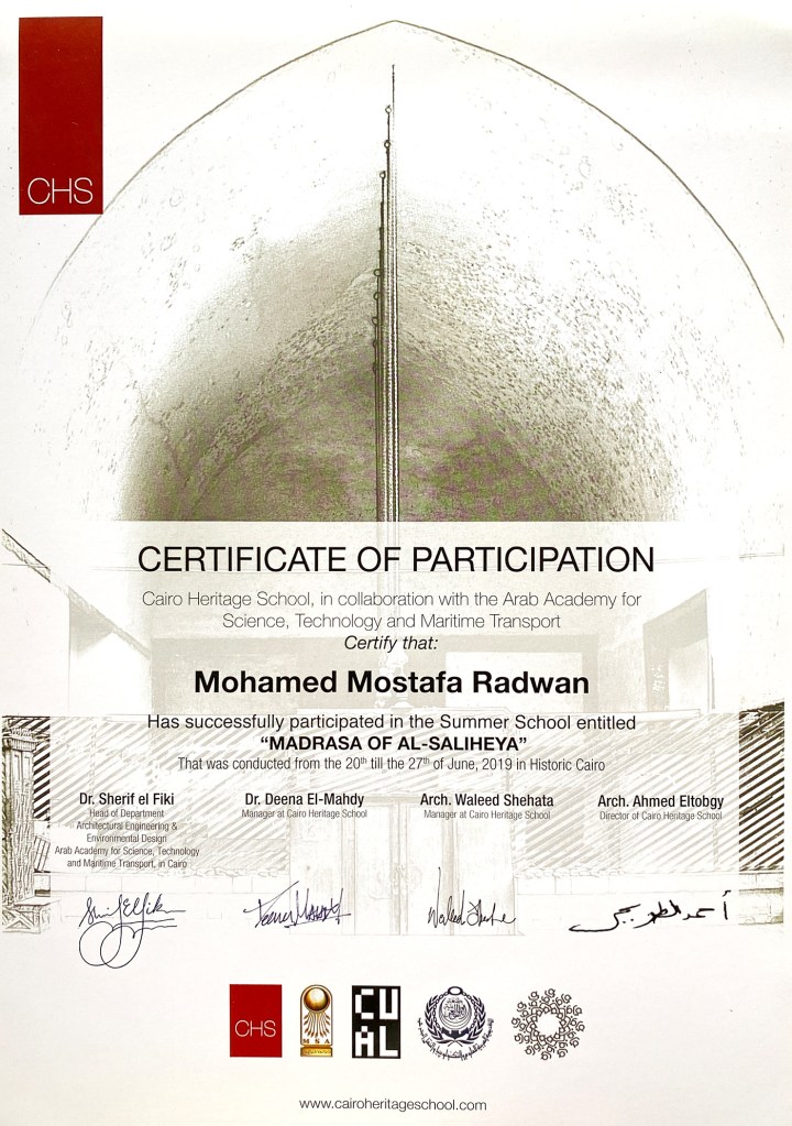 Certificate of Participation in Madrasa of Al-Saliheya Workshop, Cairo Heritage School, Egypt, June 2019