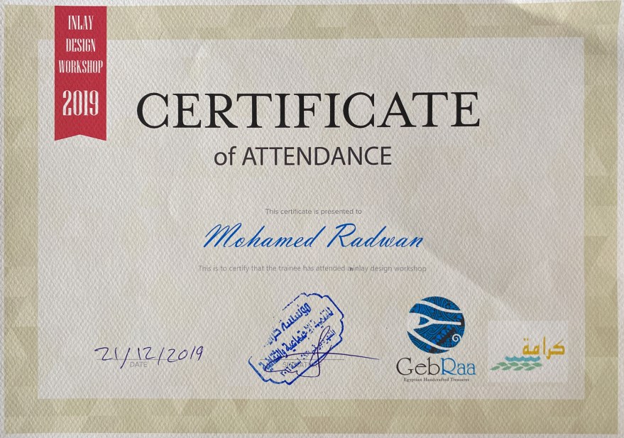 Certificate of Attendance of GebRaa Inlay Design Workshop, Egypt, December 2019