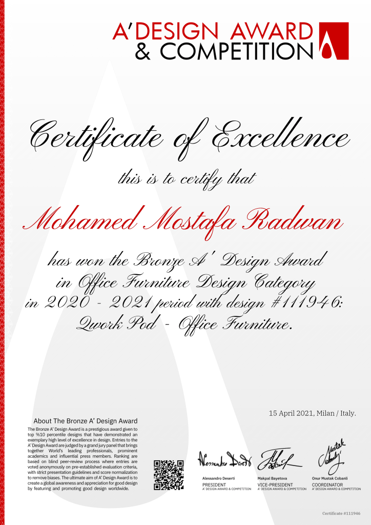 Certificate of Excellence, Bronze A’ Design Award, for Qwork Pods, in the Office Furniture category, Italy, April 2021.