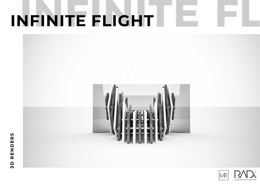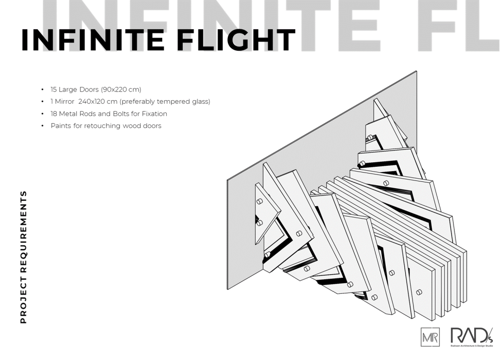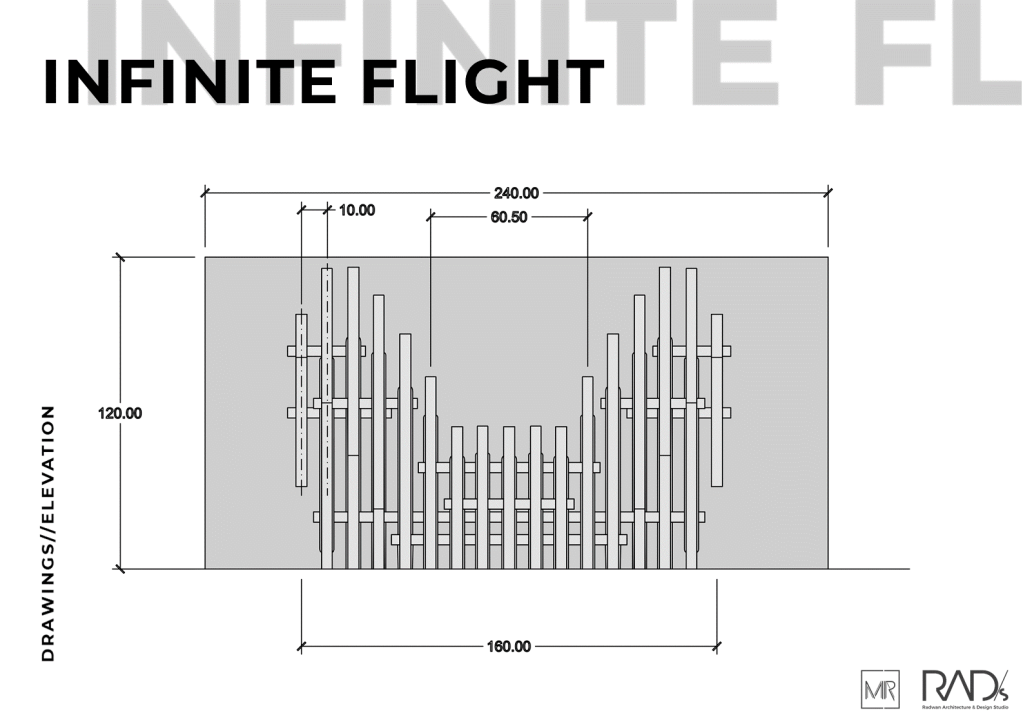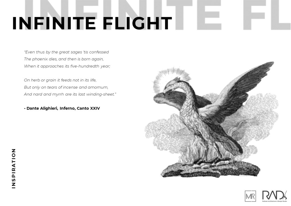 The overall form of the outdoor seating is inspired by the flight of the Phoenix, the doors are trying to fly away, and the introduction of the mirror back is to give the feel of infinity & endlessness, a concept associated with the eternal cycle of death and rebirth of the Phoenix.