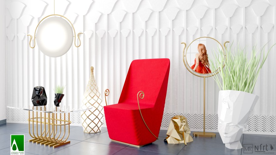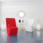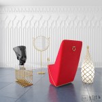 The collection is of 7 items, covering a range of Home Furniture items and accessories. Colors and materials were chosen to reflect the Ancient Egyptian Heritage: Brass, White and black glossy ceramics, and red velvet for the furniture.